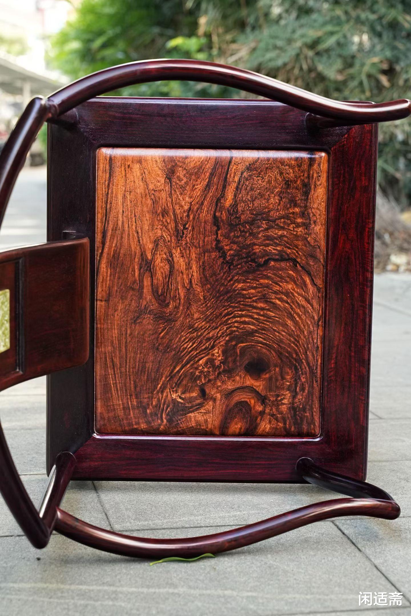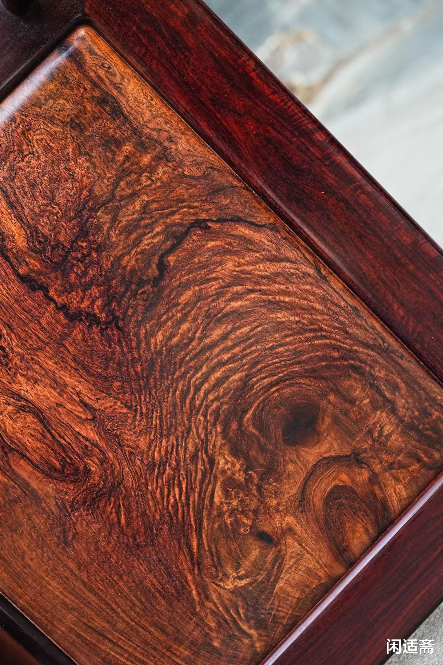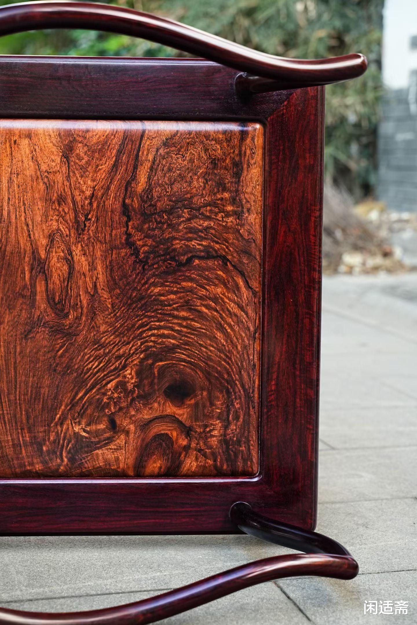整器以印度小叶紫檀为框架,小叶紫檀素有“木中之王”美誉,资源极度稀缺,木色深紫温润,质地坚硬,细腻莹泽。座面甄选海南黄花梨独板打造,尤为难得——黄花梨作为“木中黄金”,大料稀缺,独板更是一木难求,其天然山水纹如流云舒卷、山峦叠翠,纹理灵动飘逸,与紫檀框架形成深浅映衬、刚柔互补的质感,每一处木纹都是自然馈赠的独特画卷。