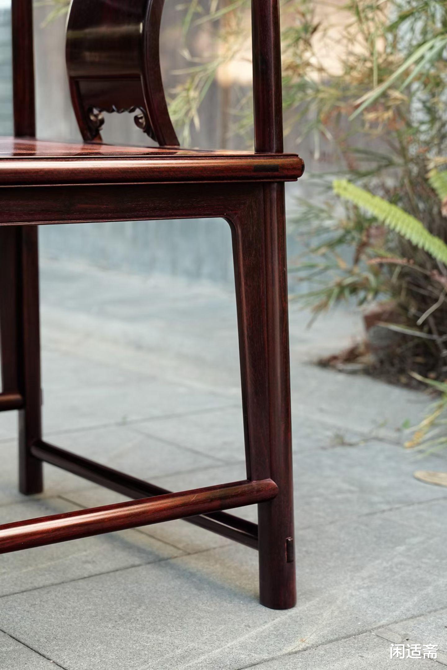 器型设计兼顾美学与人体工学,尽显明式风骨。搭脑大弯弧优美,再加三弯形靠背板依人体脊椎弧度打造,倚靠时舒适妥帖。扶手c形大弯设计,线条灵动流畅,后高前低,便于手臂支放,无联邦棍设计更加简洁。椅盘边抹作冰盘沿,上舒下敛,座面下安牙板,沿边起线简洁利落;腿足间置步步高赶枨,既强化结构稳固性,又寓意步步高升,细节处尽显古制精髓。