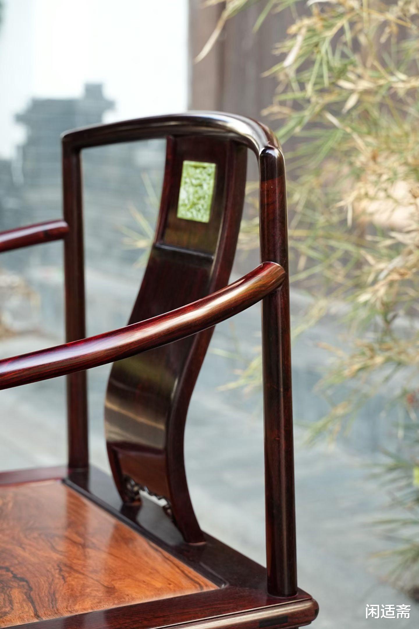 扶手采用经典“挖烟袋锅榫”工艺,榫头与榫眼精准咬合,一木连做的腿足自上而下贯通,结构稳固。靠背板为点睛之笔,采用岫玉镶嵌龙纹设计,匠人先精雕岫玉为婉转龙纹,龙形矫健灵动,鳞爪刻画入微,再将玉饰精准嵌入紫檀靠背,玉的温润莹透与木的厚重细腻相互映衬,既彰显龙纹的吉祥威仪,又添器物的雅致格调。