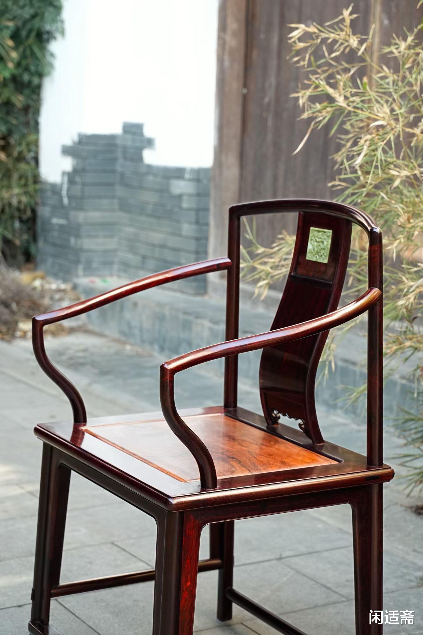 南官帽椅作为明式家具的经典范式,以搭脑与扶手不出头、拐角圆润的形制著称,盛行于江南地区,兼具文人雅韵与端庄气度,素有“文椅”之誉。这款印度小叶紫檀嵌海南黄花梨南官帽椅,集两大珍稀红木之美,融岫玉镶嵌之巧,将明式家具的“材美工巧”发挥到极致,成为兼具实用、观赏与收藏价值的雅器。