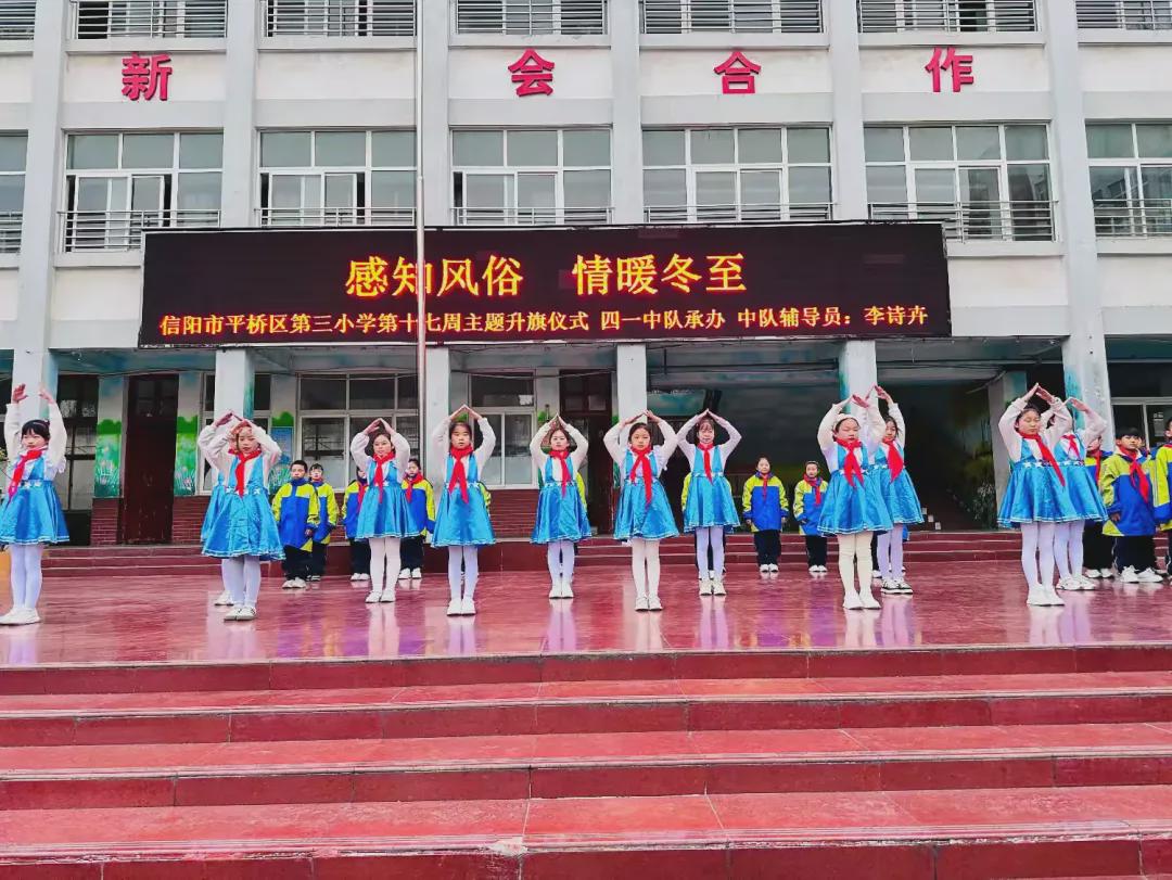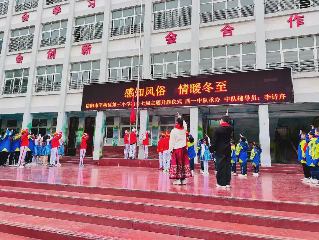在晨曦初露的清晨,当第一缕阳光温柔地拂过校园,我们迎来了充满希望与活力的一周。为了弘扬爱国主义精神,让学生了解中国传统节日,弘扬民族优秀传统,传承民族节日情怀,12月22日上午,信阳市平桥区第三小学举行了“感知风俗,情暖冬至”第十七周主题升旗仪式。