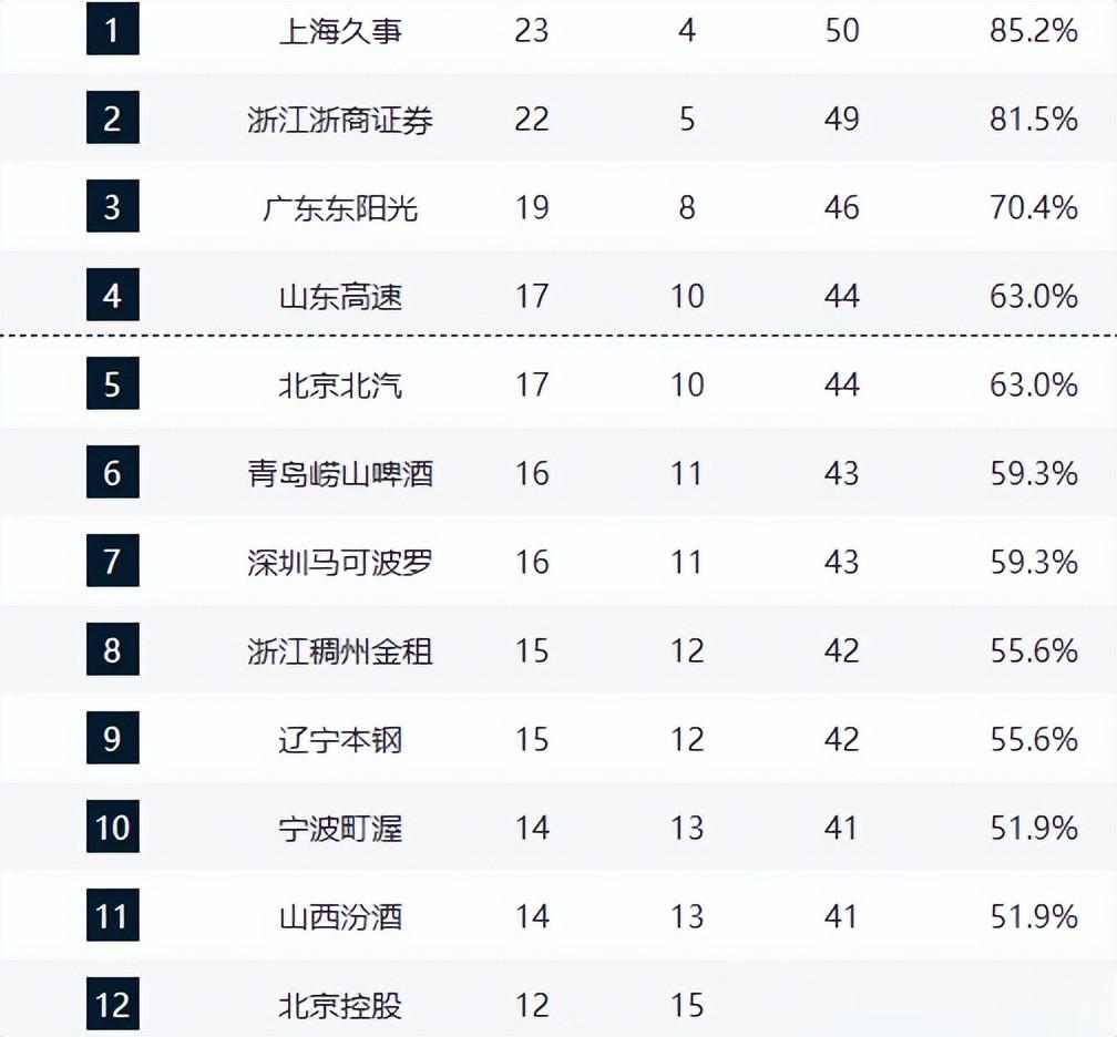 随着本轮比赛结束,上海23胜4负继续领跑,广厦22胜5负紧随其后,广东19胜8负排名第三,山东17胜10负排名第四。但是第四名至第九名,彼此最多只差2个胜场差距,每轮比赛都能改写区间位置,各队排名竞争到了白热化,下面就是CBA第二十七轮完整排名: