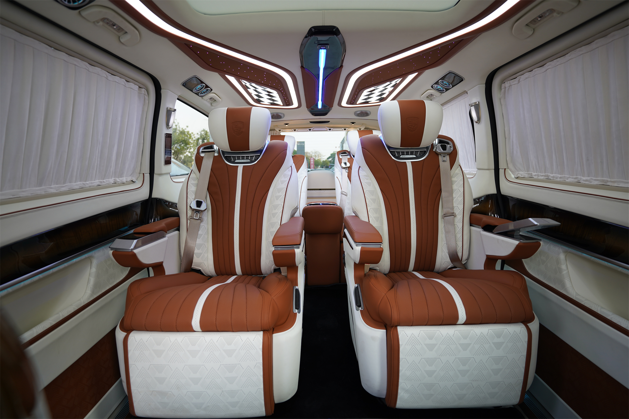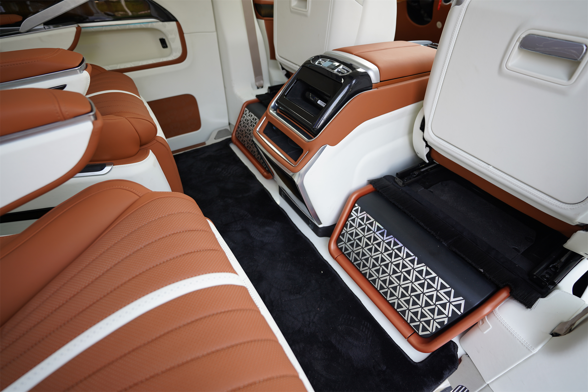 澳洲短羊毛脚垫,丝绒窗帘,航空桌板,车载保险箱设计,后排还有智能电动储物格,各种丰富配置,轻松将尊贵与实用融为一体。