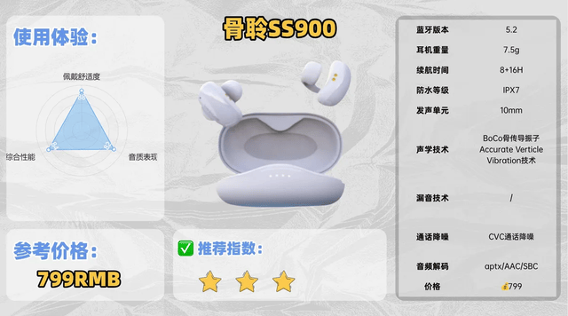 骨聆SS900采用耳夹式设计,通过弹性夹持结构实现稳定贴合,同时解放耳道,兼顾了长时间佩戴的舒适性和环境感知能力,适合户外场景。它搭载BoCo自研的10mm骨传导振子与Accurate Vertical Vibration技术,振动信号经由骨骼直接传递,能有效控制漏音,在私密性上具有先天优势。声音表现上,人声和语音类内容清晰突出,适合通话与播客聆听,但在低频表现和音乐动态范围上与传统耳机存在差异,音质取向较为鲜明。