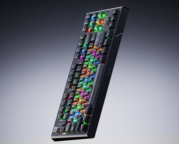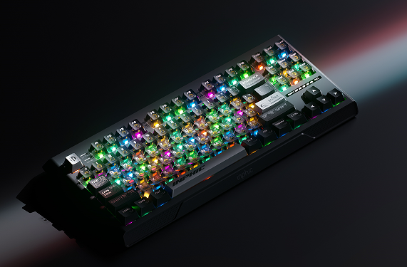 这款键盘最有辨识度的设计亮点在于“深渊镜霓虹灯带”——通过创新光学结构实现层次丰富的光影流动效果,支持主键区17种灯效与背部5种灯效切换,用户可根据游戏场景自由调节氛围光效。