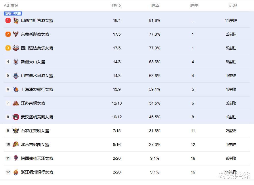 一起来看下,A组的排名和战绩,山西竹叶青酒女篮18胜4负,东莞新彤盛女篮17胜5负,四川远达美乐女篮17胜5负,新疆天山女篮14胜8负,这是排名前四位的球队。