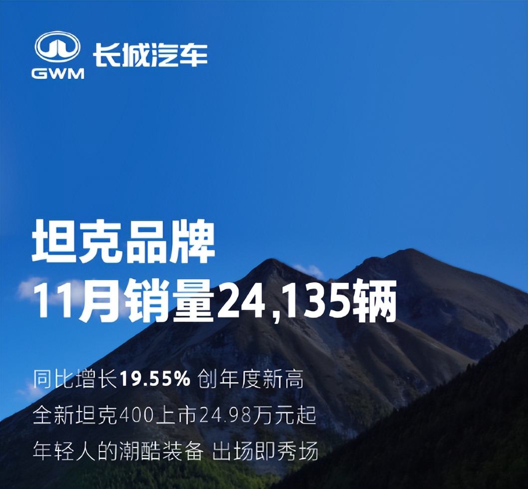 在2025年车市价格战打得昏天黑地的当下,不少品牌靠降价换销量,利润和品牌力双双承压。但有一个品牌却逆势而上,不仅11月销量交出24135辆、同比增长19.55%的成绩单,新能源车型占比还冲到了60.3%,更亮眼的是其30万元以上车型月销接近半壁江山——它就是坦克汽车。