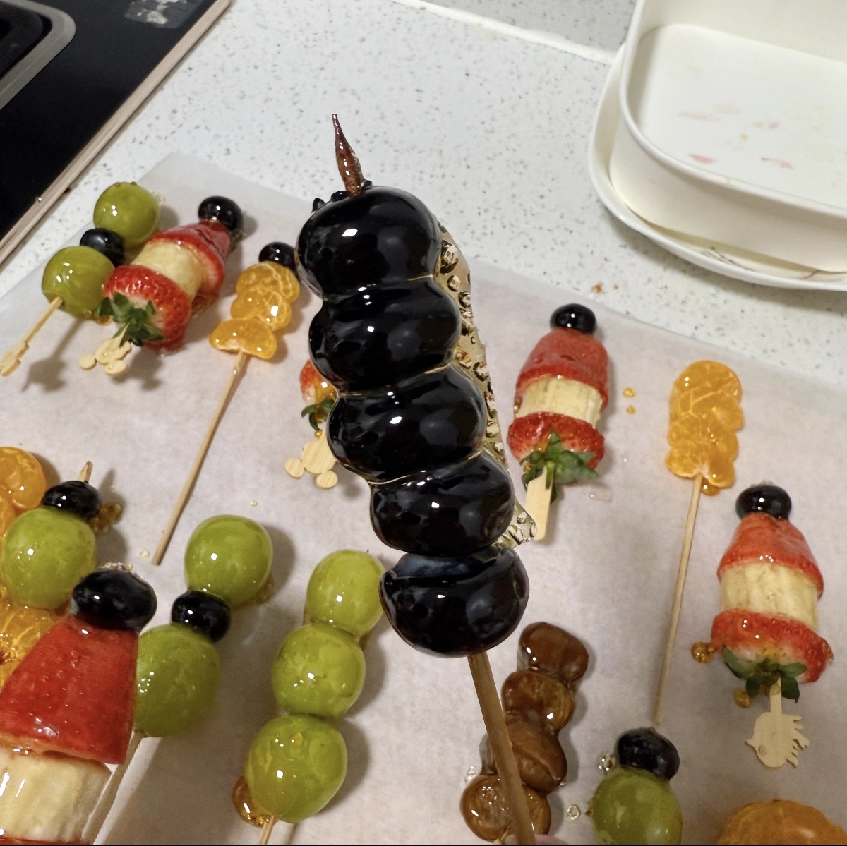 水果大变身:把你的水果朋友们洗干净,擦干水分!这一步很重要,水果表面不能有水珠,否则糖浆会不粘哦。然后,用竹签把它们一个个串起来,像串项链一样,可以单一种类,也可以混搭,色彩缤纷更好看!