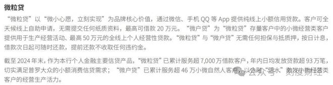 微粒贷作为微众银行个人金融主要信贷产品,截至2024年末已累计服务超7000万借款客户,年内日均发放贷款93万笔。而在微粒贷客户中,有约18%客户是无人行征信记录的“首贷户”。