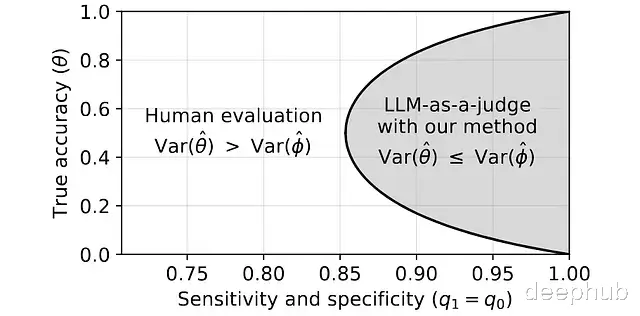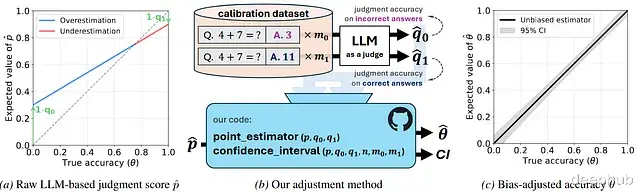 论文借鉴了流行病学中的Rogan-Gladen估计器。原理如下:先在一小批有标签的样本上测出评判者与人类的一致率得到敏感性和特异性的估计值;然后用这两个参数对观察到的分数做数学校正剥离评判者的系统性误差。