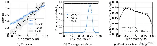不确定性量化校正偏差只是第一步,正确的评估还需要报告评估的不确定性。论文给出的置信区间构造方法考虑了两个方差来源:测试集评估的随机性,以及校准集估计误差率的随机性。