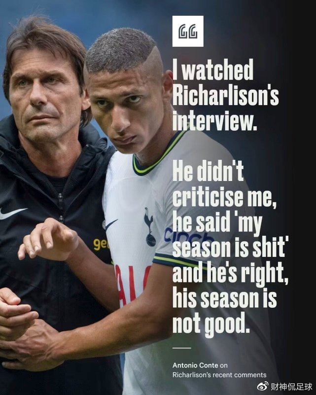 对于爱将对替补的公开不满,孔蒂也没有惯着,他展现了自己高超的语言艺术霸气回怼道:“我看了理查利森的采访,他(的采访)不是在批评我,他说‘我这赛季就是屎’,他说得对,他这赛季不怎么好!”显然孔蒂也并不满意理查利森本赛季的表现。