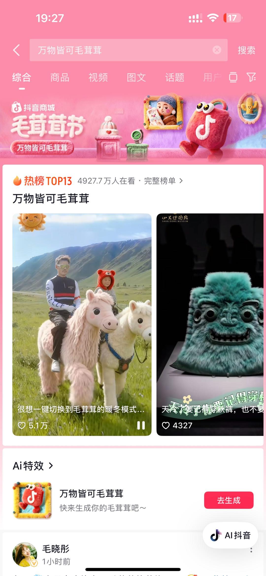 而真正推动话题实现裂变的关键,在于平台推出了“万物皆可毛茸茸”AI特效。AIGC技术日新月异的当下,年轻人早已习惯使用这类工具进行个性化创作——从绘制社交媒体头像,到将日常照片转化为动漫风格,AI的应用让创意表达变得高效。