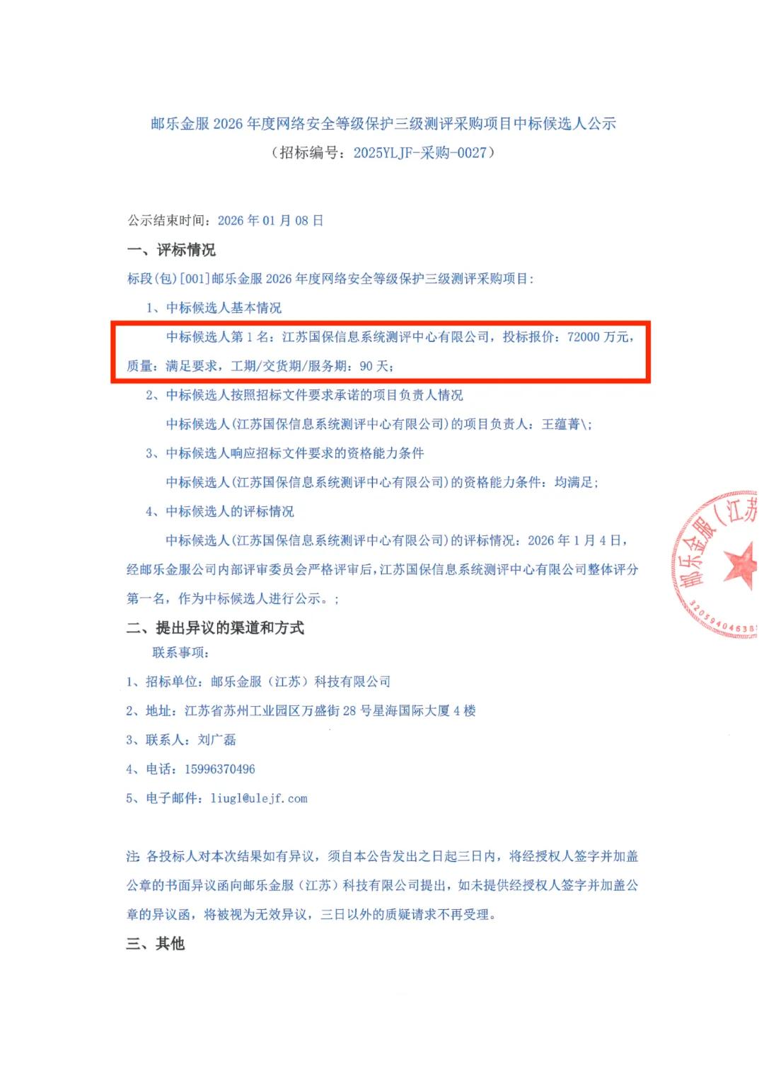 2026 年 1 月 6 日发布中标候选人公示,苏国保信息系统测评中心有限公司 72000 万元(中)。