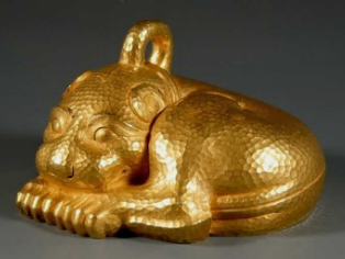 1982年出土于江苏盱眙南窑庄窖藏。金兽屈腰团身,神态警觉,空腹厚壁,浇铸成形,通体锤饰圆形斑纹。腹内部刻有“黄六”二字。含金量99%,重达18.2斤,是迄今中国出土文物中最大最重的金器,被称为“镇护之宝”。