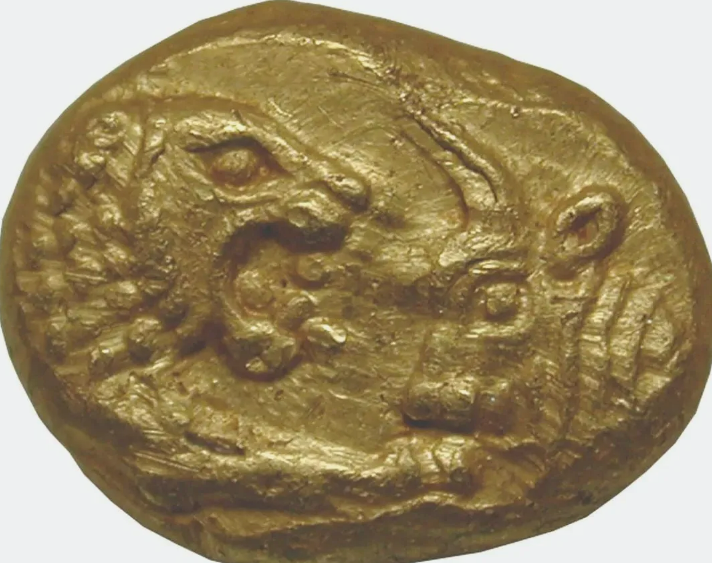 公元前6世纪左右,吕底亚(今土耳其境内)的克罗伊斯国王下令铸造金币,采用天然金银合金(俗称琥珀金)压制而成,表面常印有狮头或牛头图案。吕底亚人通过铸币暴富,成语Rich as Croesus即形容“富可敌国”。