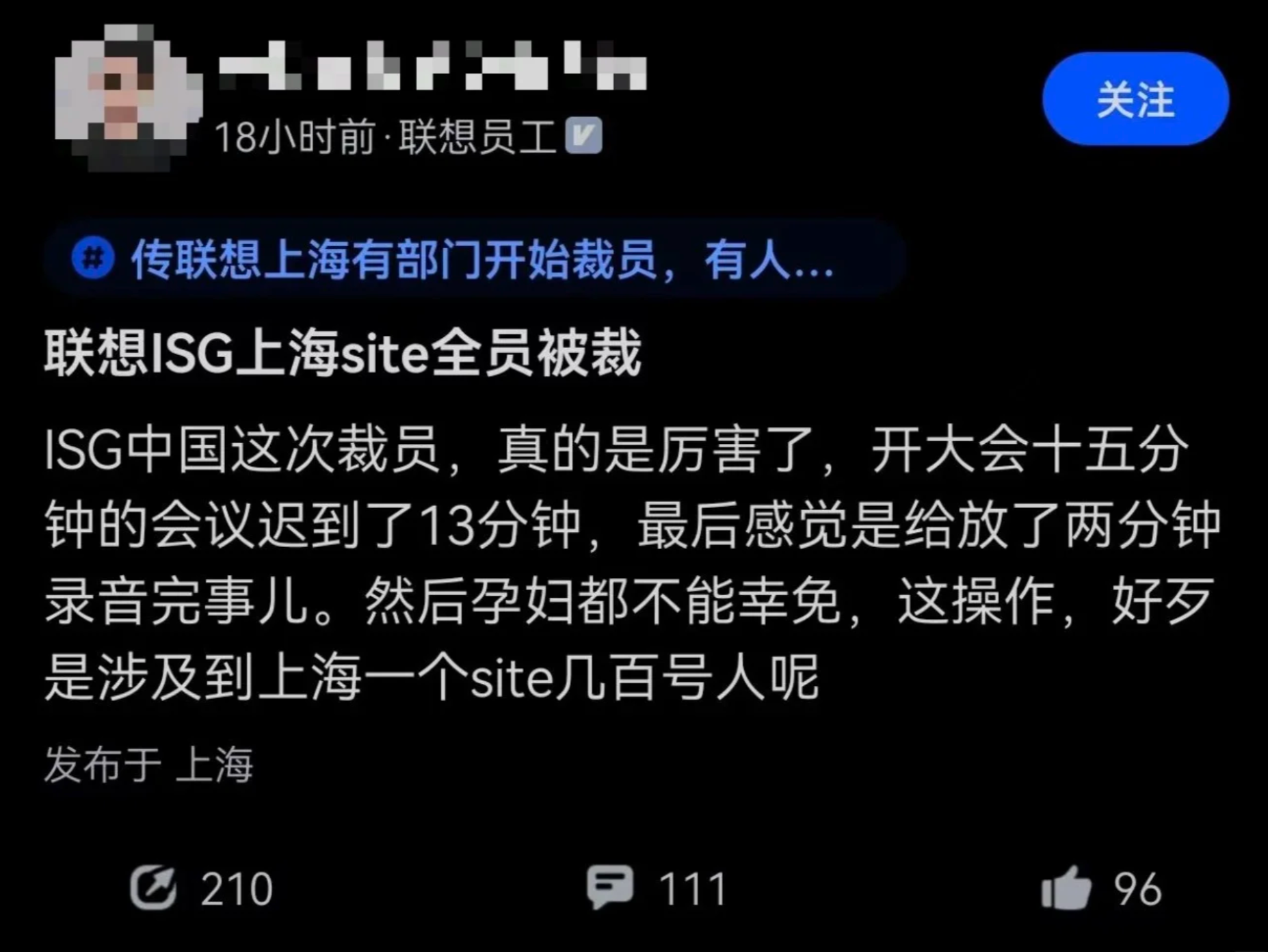 近日,多名认证为联想员工的网友在社交平台爆料,联想ISG上海团队遭遇全员裁员,此次裁员涉及人数或达数百人,甚至孕期员工也未能豁免。