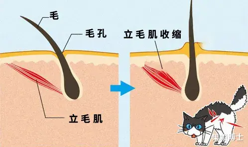 原来,猫咪的皮毛下藏着小小的立毛肌,就跟人类皮肤里的汗毛孔一样。当猫咪感到紧张、害怕或生气时,肾上腺素就会快速分泌,刺激立毛肌收缩,让毛发竖立起来。这样一来,猫咪看起来就会比平时大一圈,更有威慑力。就好比我们人类在遇到危险时会毛骨悚然一样,猫咪炸毛也是一种自我防卫的能力。