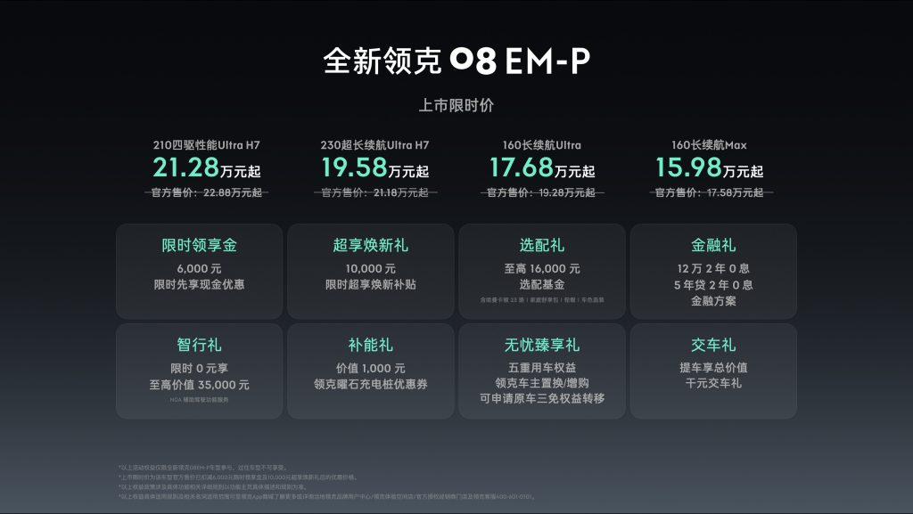 今日,“家庭豪华智混SUV”全新领克08 EM-P正式上市。新车提供160长续航Max、160长续航Ultra、230超长续航Ultra H7、210四驱性能Ultra H7四款车型可选,官方限时价15.98万元–21.28万元。同时,伴随新车上市还有限时领享金、超享焕新礼、选配礼、金融礼、智行礼、补能礼、无忧臻享礼、交车礼在内的8重限时福利。