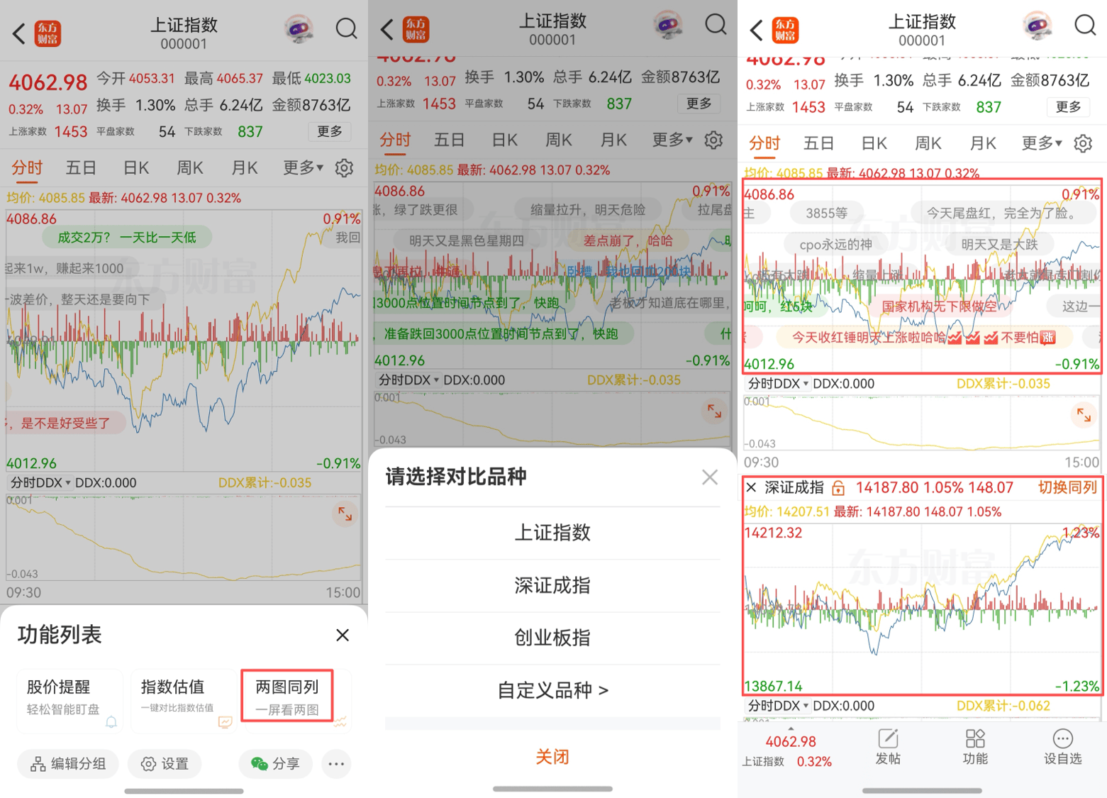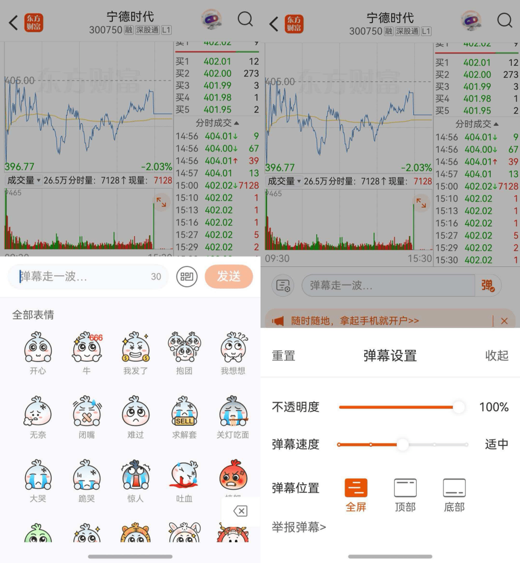 个股页面支持一屏展示两幅分时图,方便对比不同品种的走势变化;