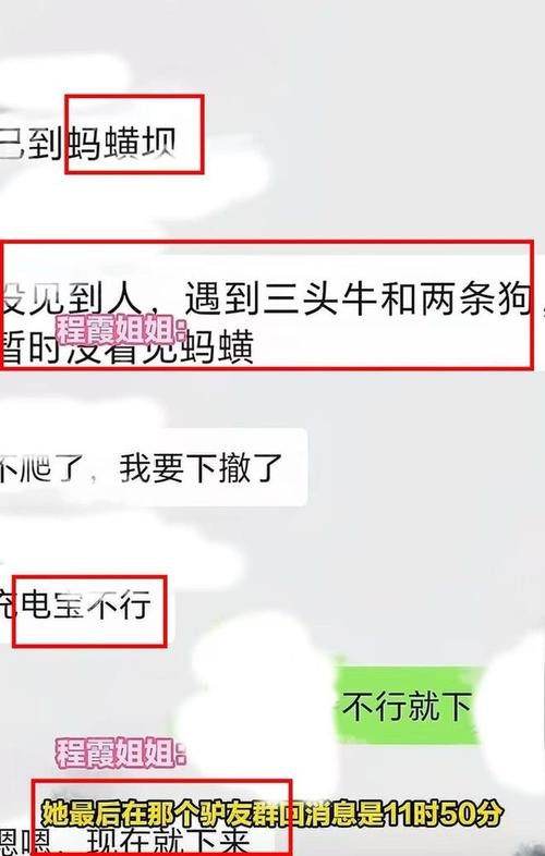 没过几个小时,快12点的时候,程霞又在驴友群里说,自己不爬了要下山,以为充电宝好像出问题了,自己手机也快没电了。