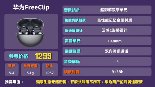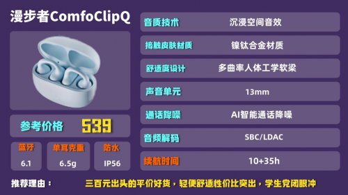 品牌简介:漫步者作为国民音频品牌,这款ComfoClipQ主打高性价比和日常实用,适合学生党、上班族日常通勤使用。