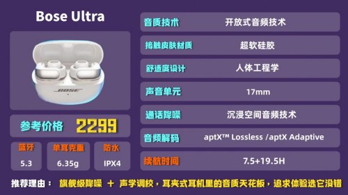 品牌简介:Bose在音频技术上一直很有话语权,这款Ultra开放式耳机主打全天舒适佩戴和沉浸音质,定位中高端市场,适合对体验有高要求的用户。