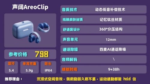 品牌简介:声阔作为音频领域的新锐品牌,这款AreoClip主打均衡体验,在音质和智能功能上都有不错表现,性价比在中价位里很突出。