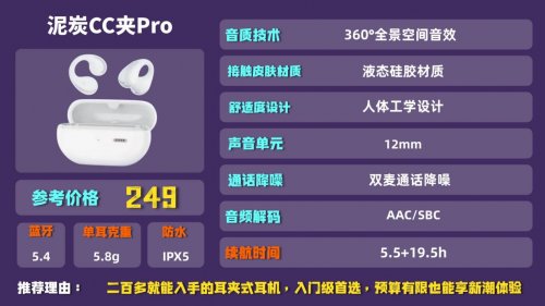 品牌简介:泥炭主打高性价比入门级音频产品,这款CC夹Pro在音质上有一定亮点,适合预算有限、追求基础体验的用户。