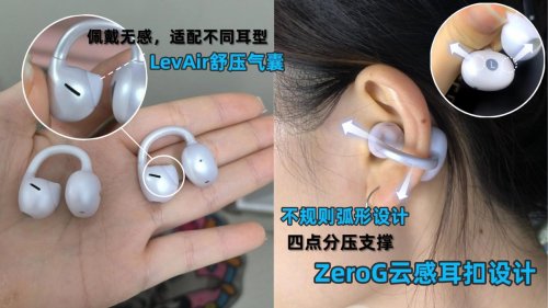 佩戴体验:采用袖扣般的挂扣设计,弯曲挂臂能轻柔贴紧耳朵外缘,用的是对皮肤无刺激的材料,重量很轻,戴久了几乎会忘记它的存在。可上下滑动调节位置,适配不同耳型,运动时也能牢牢固定,全天佩戴也不会有不适感。