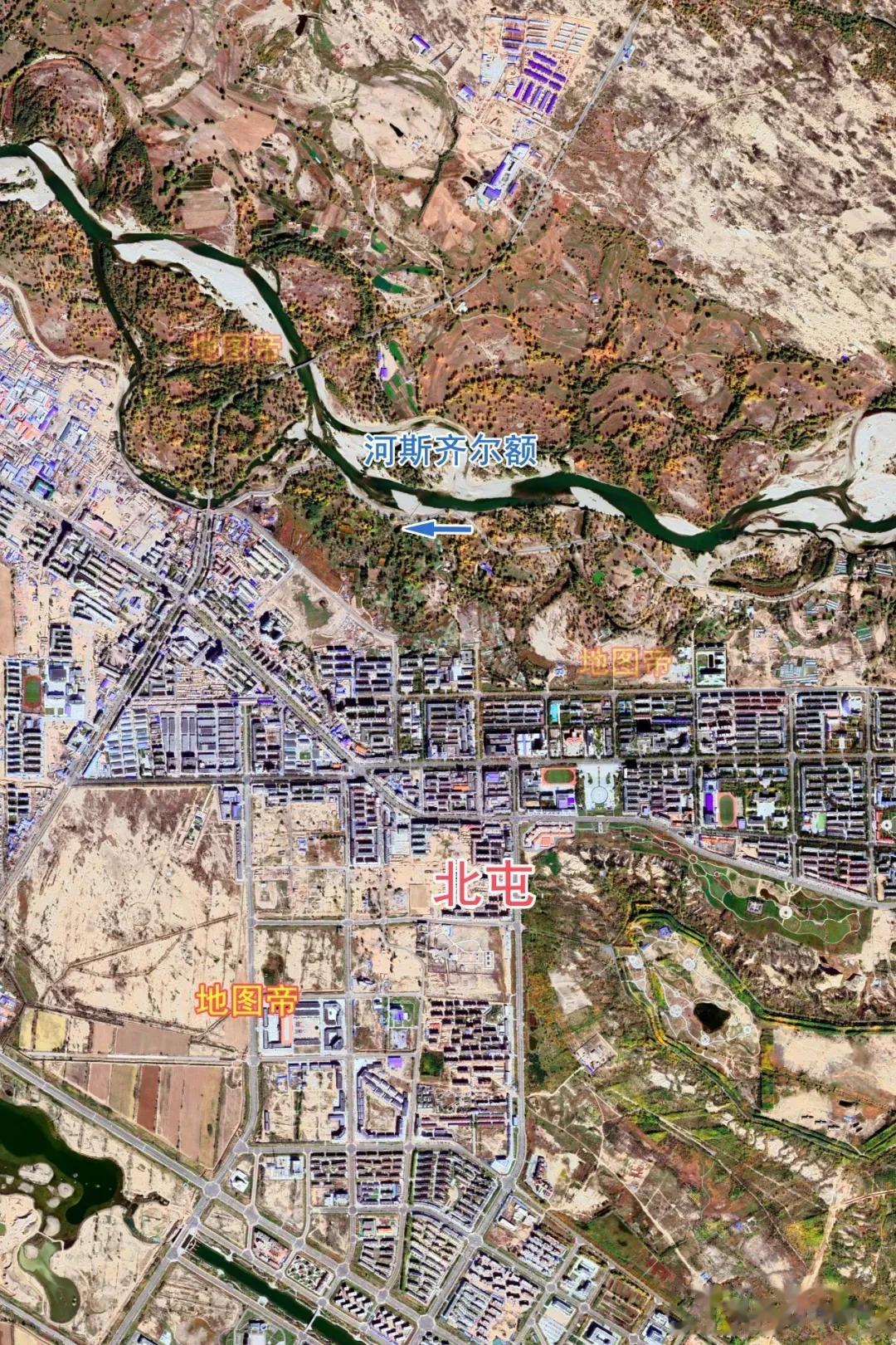 额尔齐斯河离开富蕴县城后,呈东南-西北走向流去。额尔齐斯河南岸不远是沙漠地带,216国道就与额尔齐斯河平行前进,来到北屯市。