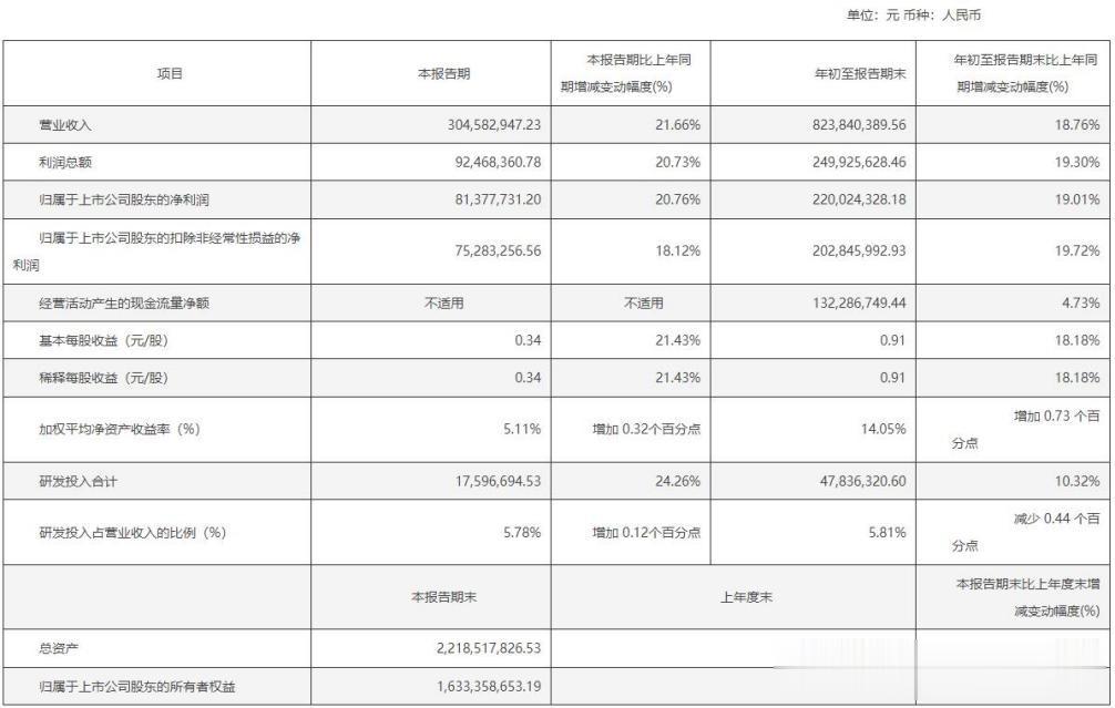 2025年前三季度公司实现营业收入823840389.56元,同比增加18.76%;实现归属于母公司所有者的净利润为220024328.18元,同比增加19.01%;实现归属于母公司所有者的扣除非经常性损益的净利润为202845992.93元,同比增加19.72%。