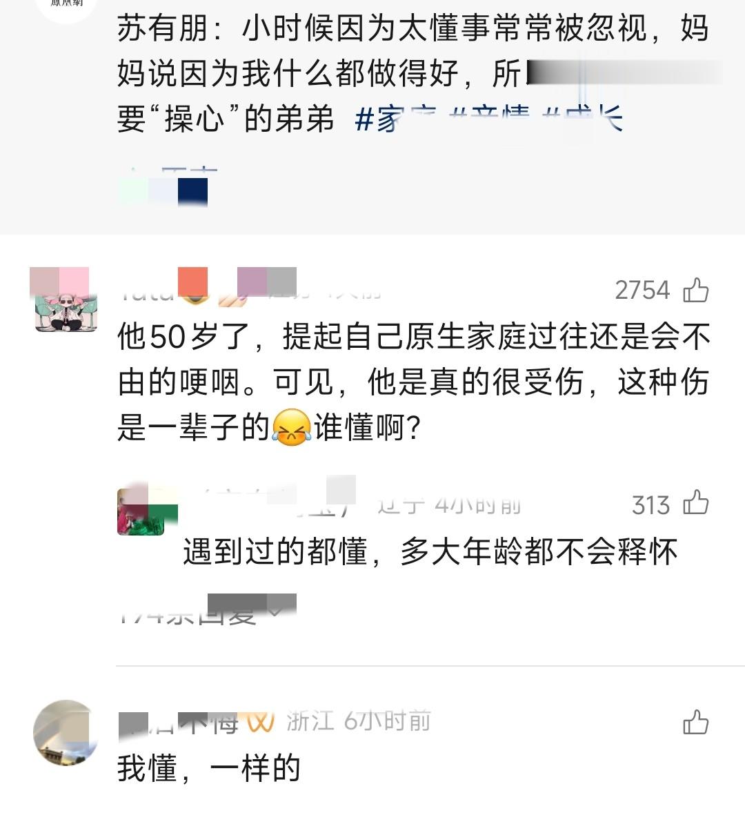 苏有朋已经52岁了,当面对镜头前提及自己的原生家庭还是忍不住哽咽,令他无法释怀,因为太懂事而被妈妈忽略,不受到妈妈的关注,苏有朋妈妈还以此为理由,去关心更需要“操心”的弟弟。