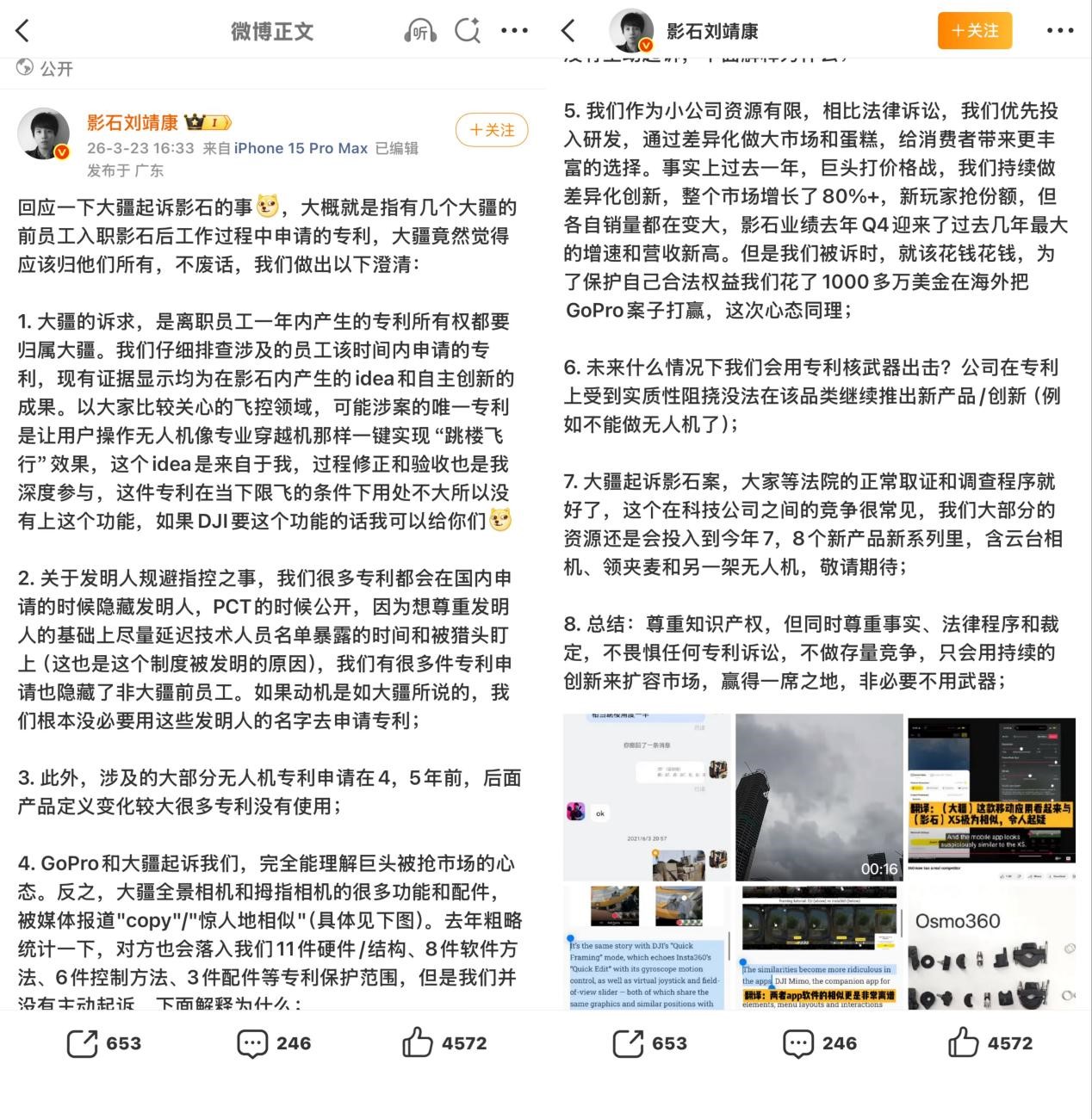 3月23日,影石CEO刘靖康在微博表示,大疆诉求中提到的离职员工的专利,影石现有证据显示其均为自主创新的成果,并非大疆所称应归其所有。并称“大疆起诉我们,完全能理解巨头被抢市场的心态”。 这一说法虽旨在淡化针对性,却也折射出科技行业激烈人才攻防下的某种现实。