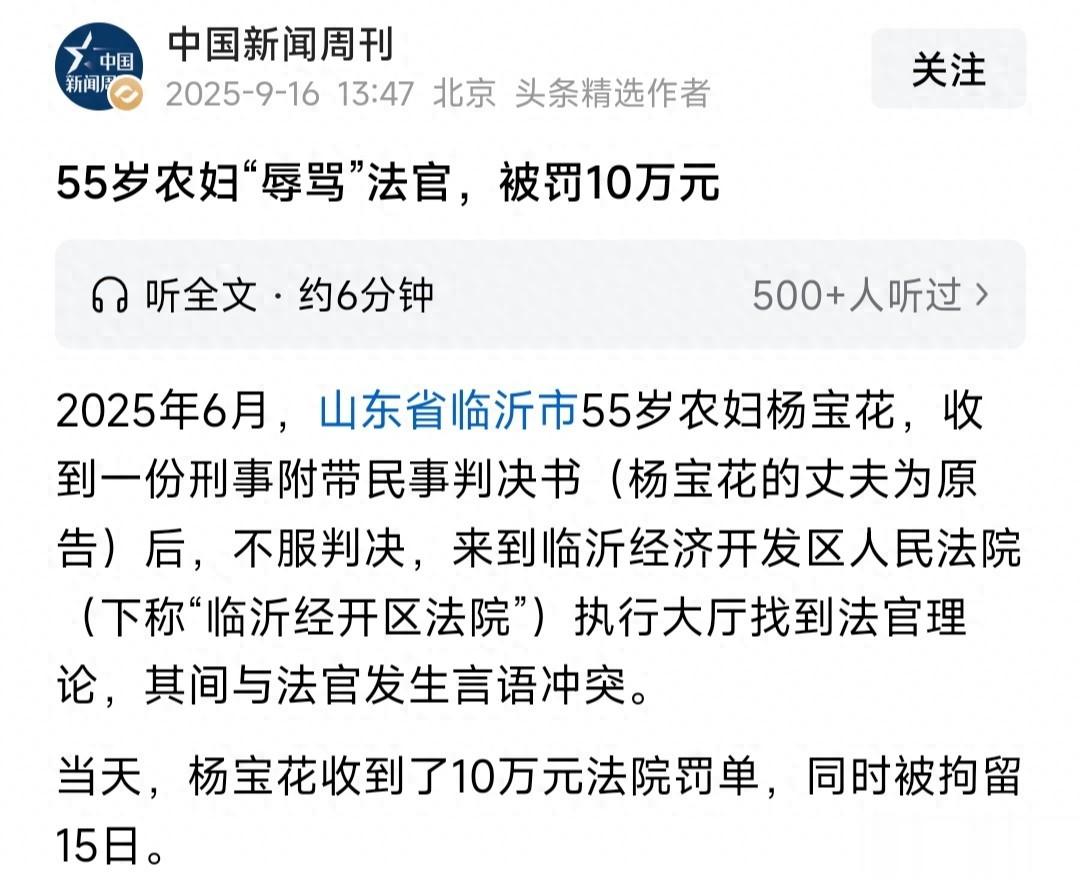 《55岁农妇“辱骂”法官,被罚10万元》这是《中国新闻周刊》于9月16日发布一条新闻。