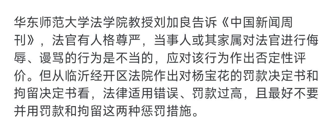 对此,华东师范大学法学院教授刘加良对此次事件也提出了质疑,认为该案法律适用错误,罚款过当。并且杨宝花是在判决做出后在执法大厅与法官争执,并非在审判过程中,根本谈不上“违反法律秩序”。