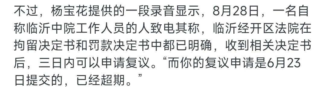 5日后,心中充满委屈的杨宝花向临沂中院申请了复议,可又被工作人员的一句“三日内可以申请复议,你这都超期了”而挡了回去。