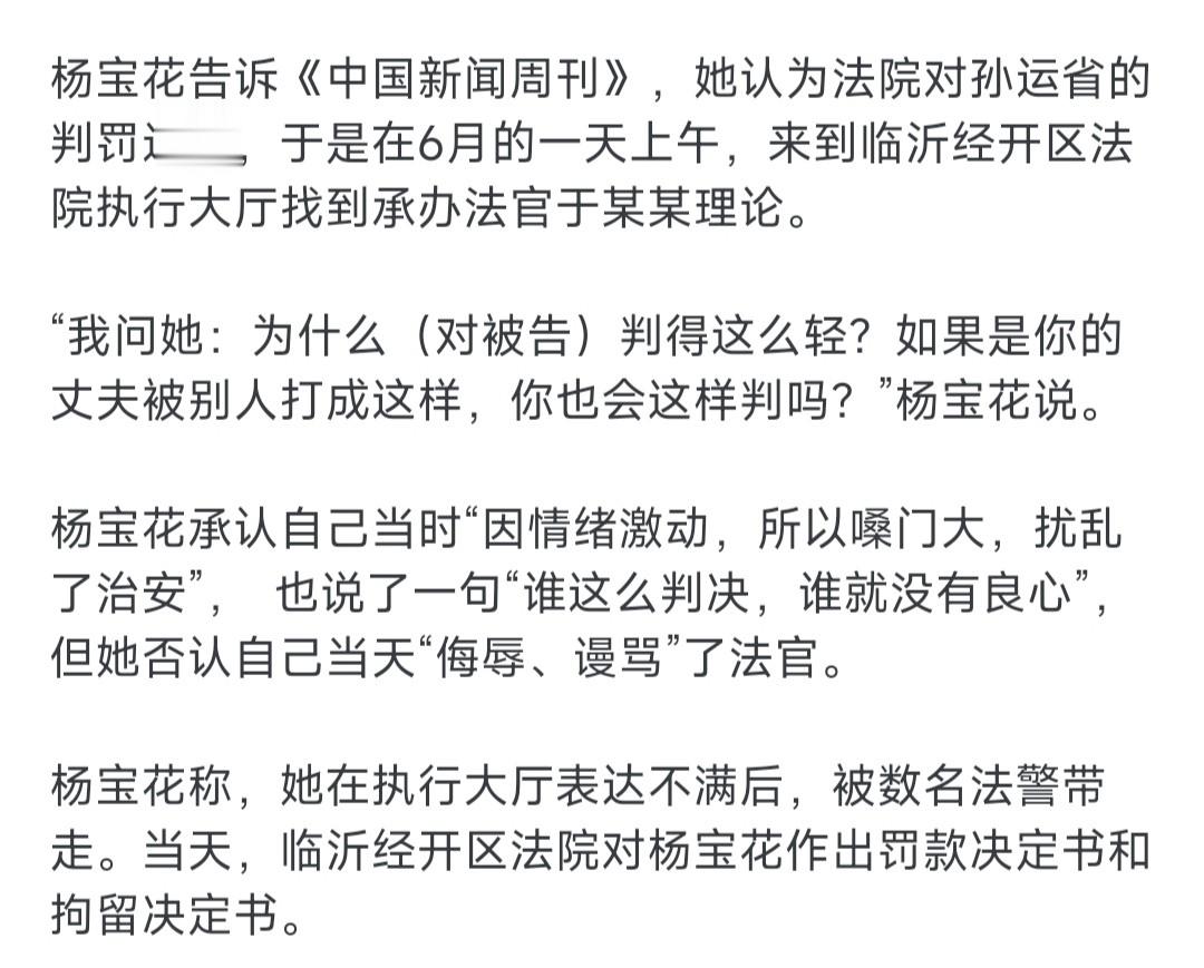 杨宝花告诉记者,当天她从没有辱骂过法官,只是自己的嗓门比较大,情绪比较激动,最多算是扰乱治安,而且自己只是问了一句“为什么(对被告)判决这么轻?如果是你的丈夫被人打成这样,你也会这样判吗”,后来又说了一句“谁这么判决,谁就没有良心”。