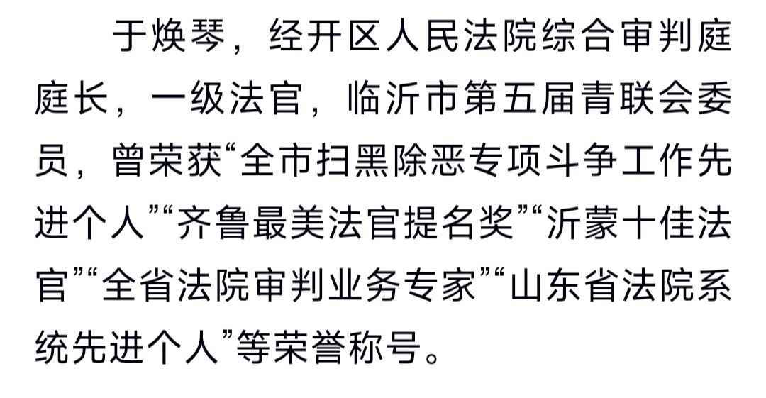 于焕琴,临沂经开区人民法院综合审判庭长,一级法官,曾获得多项荣誉。