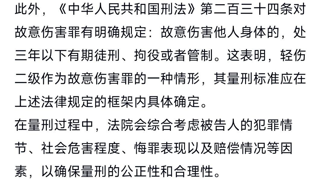 再来看《中华人民共和国刑法》第二百三十四条,其中对故意伤害罪有明确规定:故意伤害他人身体的,处三年以下有期徒刑、拘役或者管制。这表明,轻伤二级作为故意伤害罪的一种情形,其量刑标准应在上述法律规定的框架内具体确定。