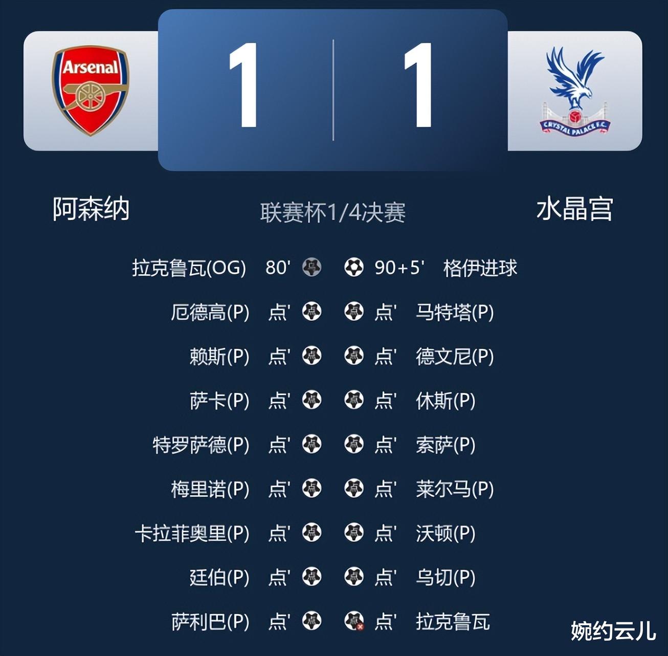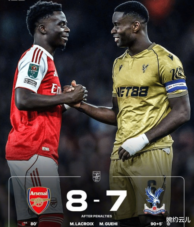 两队进入点球大战后,踢到第八轮,当拉克鲁瓦的点球被凯帕稳稳扑出的瞬间,酋长球场的球迷才敢于欢呼。赛后,阿森纳仍要四线征战,但是这样不稳定的发挥也可能导致四大皆空的悲剧。和此前三场1/4决赛的比赛过程相比,切尔西3比1卡迪夫城、曼城2比0布伦特福德、纽卡2比1富勒姆的比赛更为轻松。