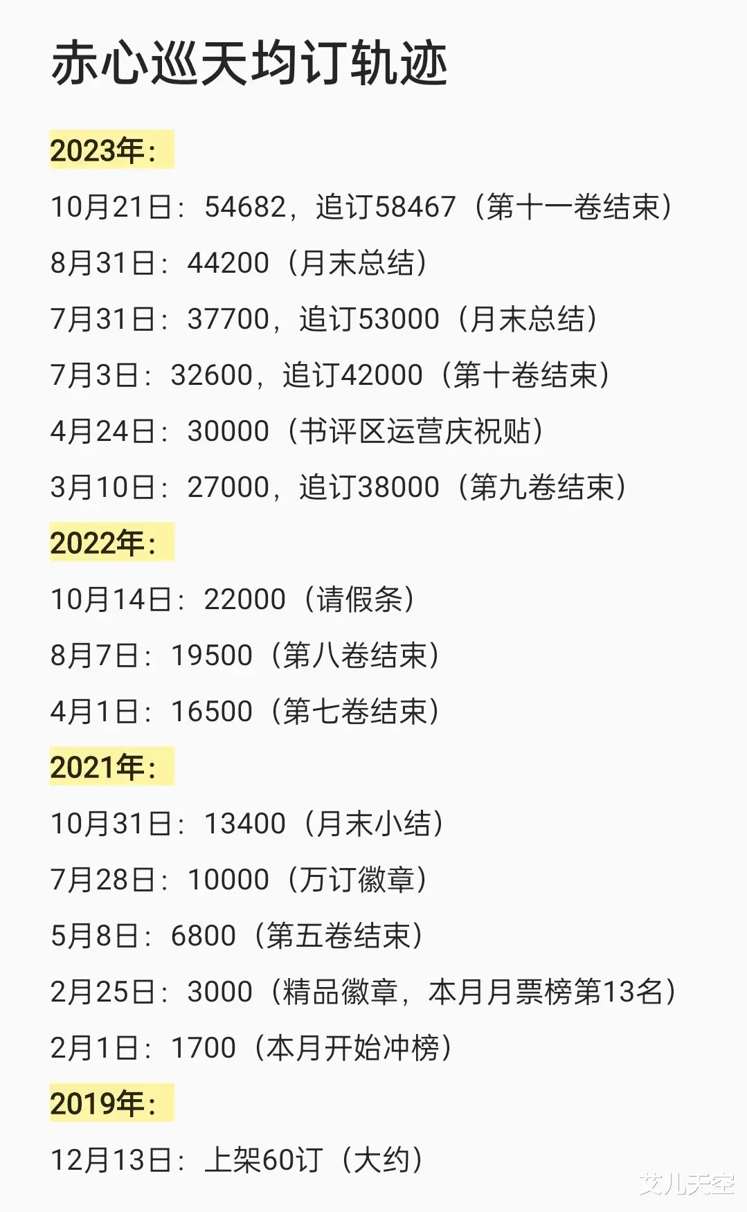 最后放一下《赤心巡天》的均订成绩上升轨迹,数据基本来自于情何以甚自己的总结,还有起点官方的成绩徽章。