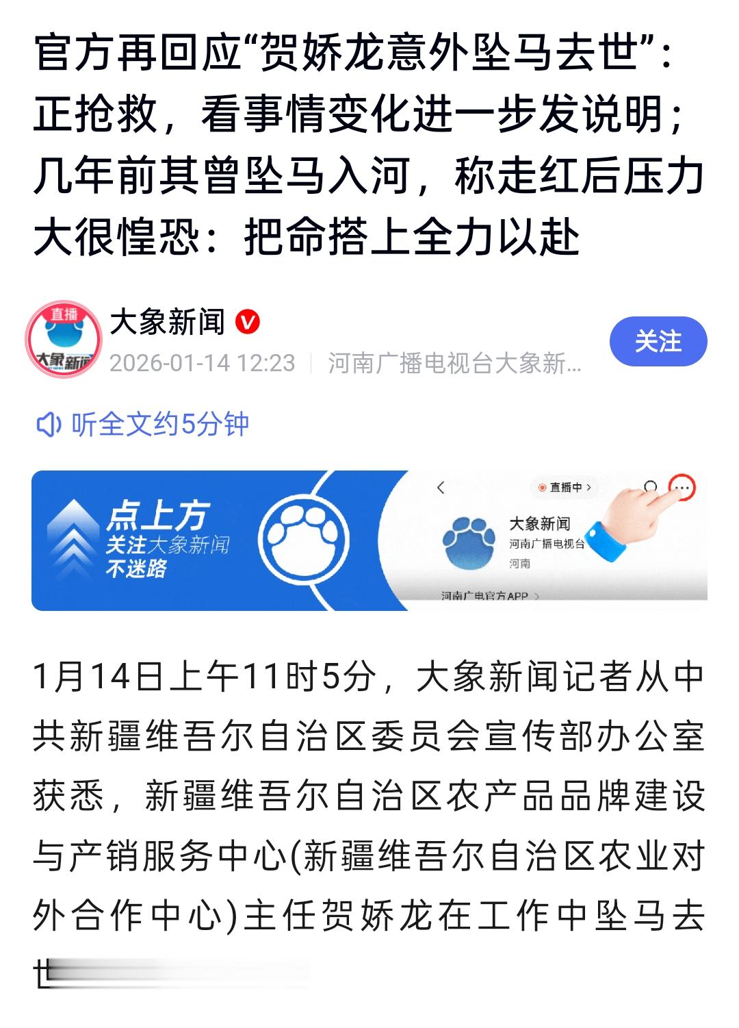 今天(1月14日)上午,“贺娇龙因意外坠马逝世”的消息在网络传播,引发了网友关注。报道称,贺娇龙日前在工作中意外坠马,经抢救后医治无效不幸离世。