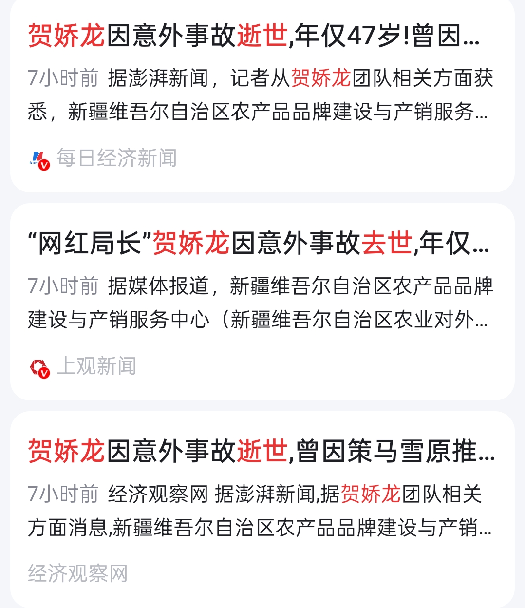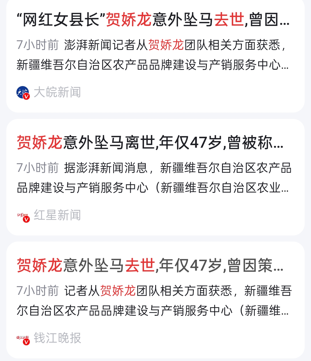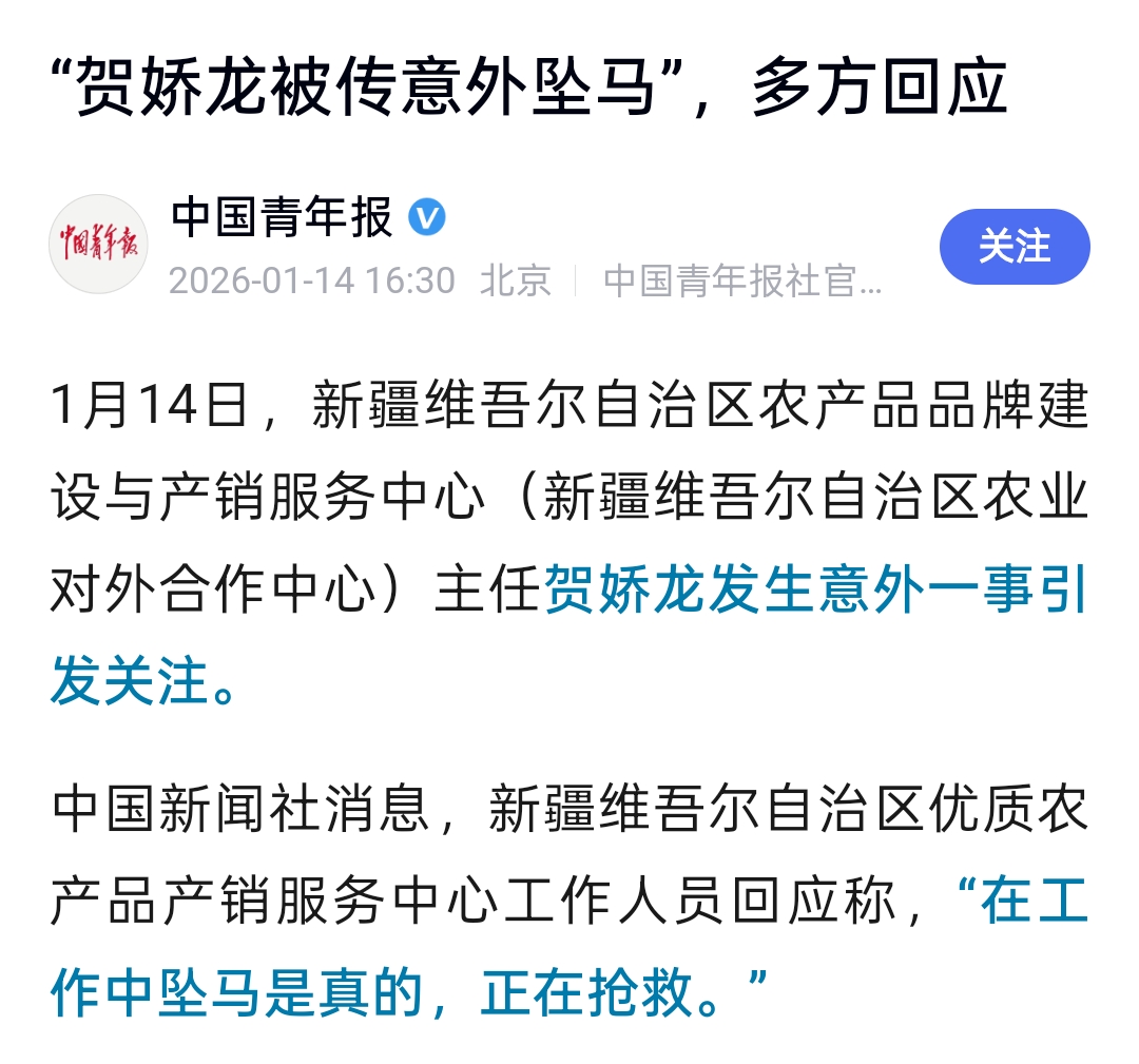 中午时分,有多家媒体援引新疆维吾尔自治区农产品品牌建设与产销服务中心工作人员和新疆维吾尔自治区宣传部办公室工作人员的说法称,贺娇龙在工作中坠马去世,为不实消息。