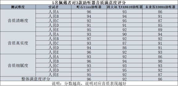 测评方法:在本次测评中,我们找了5名受试者,通过对这三款助听器进行同一环境下的听音测试,观察音质表现。并通过让这5名受试者对音质的清晰度、真实度、细腻度表现进行打分,了解哪些助听器音质表现更为出色。