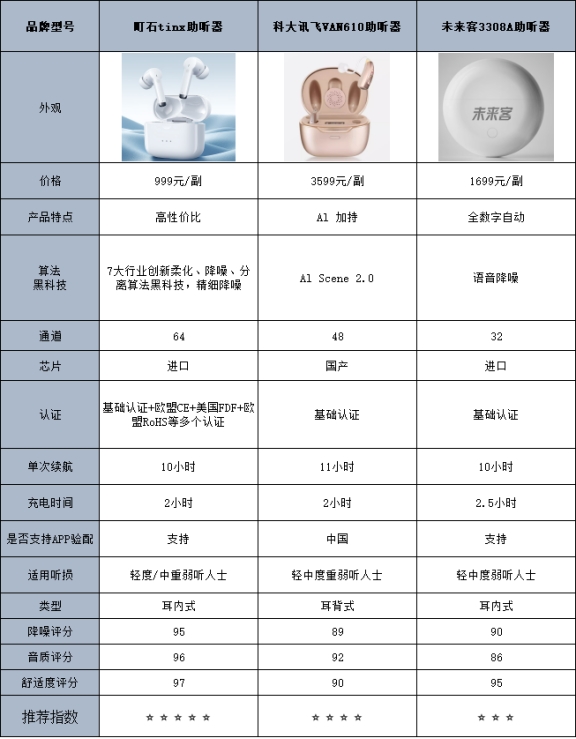 测评结果:町石 > 未来客 > 科大讯飞町石助听器降噪测评表现:町石的降噪能力真的让人印象深刻。它能在不同的环境中有效消除背景噪音、风噪和啸叫等不适感,确保听感清晰又自然。尤其在嘈杂的环境下,它依然能够保持语音的清晰度,让你完全不受噪音的干扰。它内置了进口芯片和7重降噪算法,加上SC-PIIE分段分区降噪技术,能够根据不同场景智能调整,自动识别657种噪音,并实时优化声音表现。实际测试中,它的降噪效果提升了215%,这在同价位产品中真的算是遥不可及了。未来客助听器降噪测评表现:未来客的降噪效果还算不错。 在一些中等噪声的环境中,比如餐厅和办公室,它能较好地抑制背景杂音,提升语音的清晰度。佩戴起来也挺舒适。降噪技术在安静环境下表现很好,但一旦进入像街道这样的嘈杂环境,它的表现就显得有些局限了。背景噪音的过滤效果不够彻底,尤其是高频噪音可能会影响清晰度。总体来说,它非常适合日常低噪音环境,但面对极端的噪音场景,降噪效果就略显不足了。科大讯飞助听器降噪测评表现:科大讯飞的降噪效果算得上中规中矩。 在安静的环境里,它能够有效去除背景噪音,让语音听起来很清晰。可是,当环境噪音增加,比如在餐厅或街道上,它的降噪效果就有些欠缺了。背景噪音并没有完全隔离开来,导致语音辨识度有所下降。尽管它配备了比较先进的降噪技术,但在复杂的噪音环境下,它的表现依然还有提升空间。