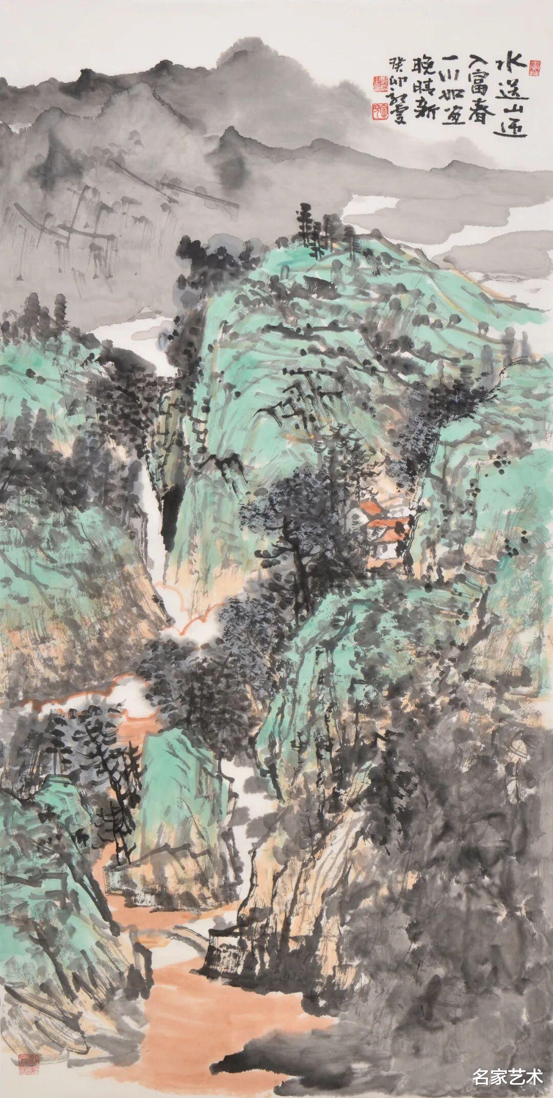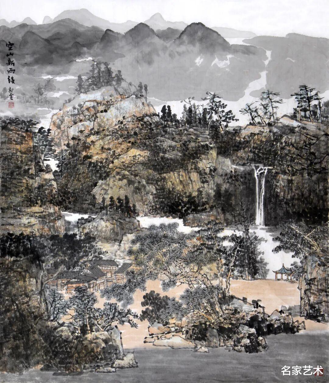 郭雯的作品可以用“恬静灵动总相宜”来形容她的艺术风采。恬静,从她的画中能看到追求的玉宇无尘的境界。画面干净雅致,线条稳重,不急不躁,表达了她内心所向往的美好世界。借助笔墨,把自己的感悟流露纸上,使画作有淡然释怀、徐风拂面之感。灵动,是她山水画呈现出来的万木葱茏,潺潺溪流,瀑布直下,云飞雾腾,表现了山水的蓬勃生机,昂扬的生命力。近则高山耸立,远则峰峦叠嶂,烟雾缭绕,荡气回肠,趣味跃然生动。