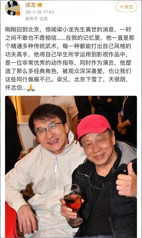 梁小龙去世的消息传出后,演艺圈集体悼念。成龙从北京发长文:“梁兄,北京下雪了,天很阴,怀念您。”他回忆两人合作《飞渡卷云山》时,梁小龙一招一式皆真功夫。