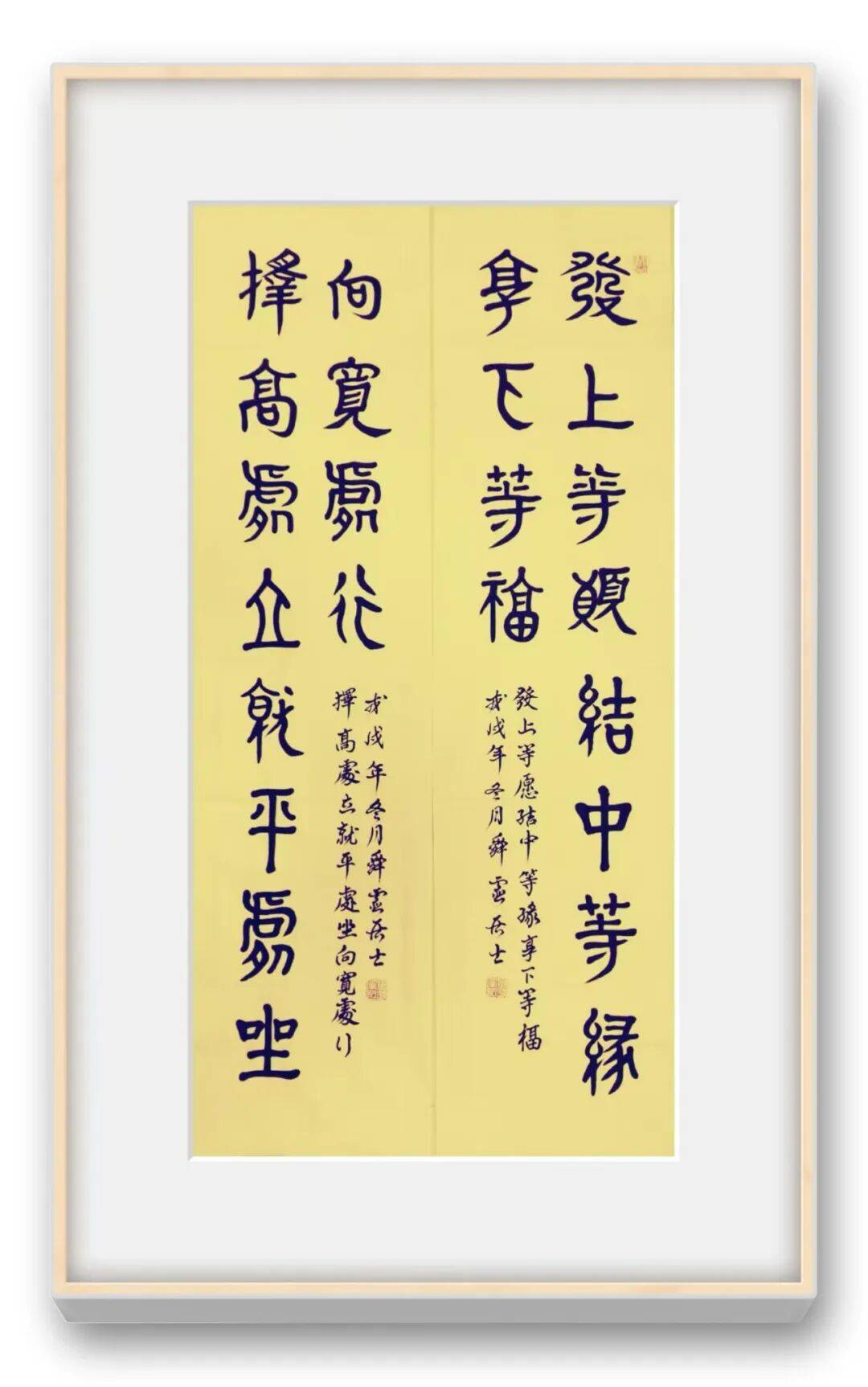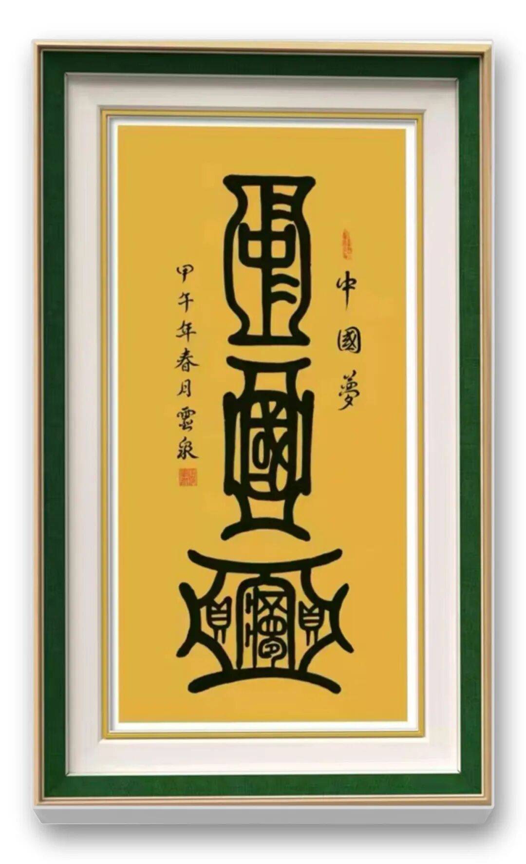 在篆书创作上,王海军老师的造诣尤为深厚,堪称当代篆书艺术的鲜明标杆。他师法《峄山碑》的典雅圆活与《泰山碑》的正大气象,更参酌石鼓文的朴拙意趣,将传统篆书的法度精髓烂熟于心、融会贯通,形成了根基深厚而又独具个性的篆书风格。他深谙篆书“结体严谨、瘦劲挺拔”的特质,每一笔都恪守中锋行笔之道,转笔处逸转流畅,无半分滞涩,尽显“笔里有墨,墨里有笔”的深厚修为。观其篆书作品,线条如铁线般坚韧,笔力千钧却收放自如,实笔重缓浓墨、虚笔轻速干润,虚实互补间尽显力透纸背的质感;结体端庄规整却不僵化,字字兼具“跃、腾、奔、卧”的人格姿态,既保持了篆书面目的纯粹性,又规避了千字一面的刻板弊病,将“楷精法详”的法度意识贯穿创作始终。
