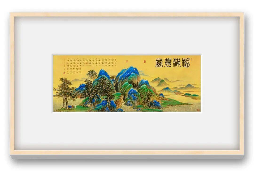 王海军老师以青绿山水为骨,金笺为底,石青石绿的山峦在金色衬映下既具古画的堂皇大气,又添了几分当代审美中的雅致明艳。山间林木苍郁,水波澹澹,隐士观山的细节更让画面有了“心远地自偏”的悠然意趣,篆书名与心经文字的融入,让山水不止于形,更承载着福慧双修的东方哲思。